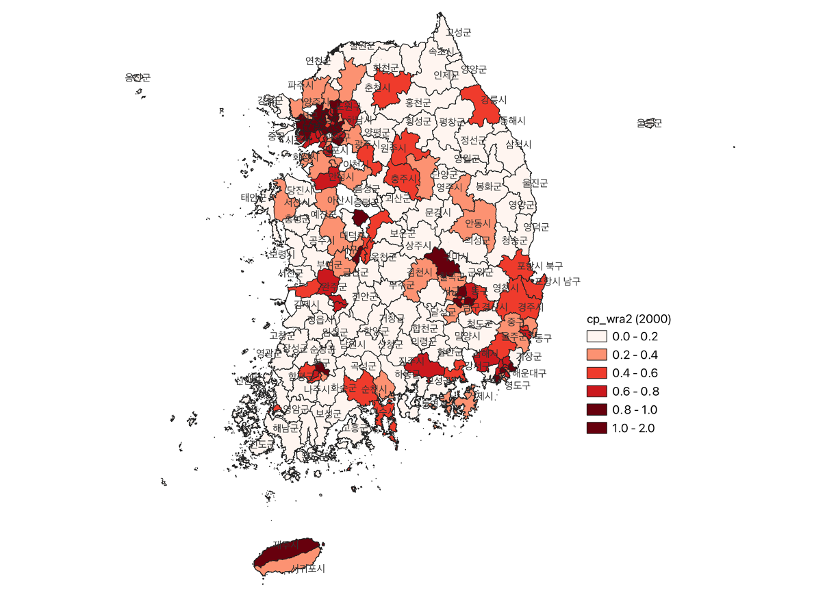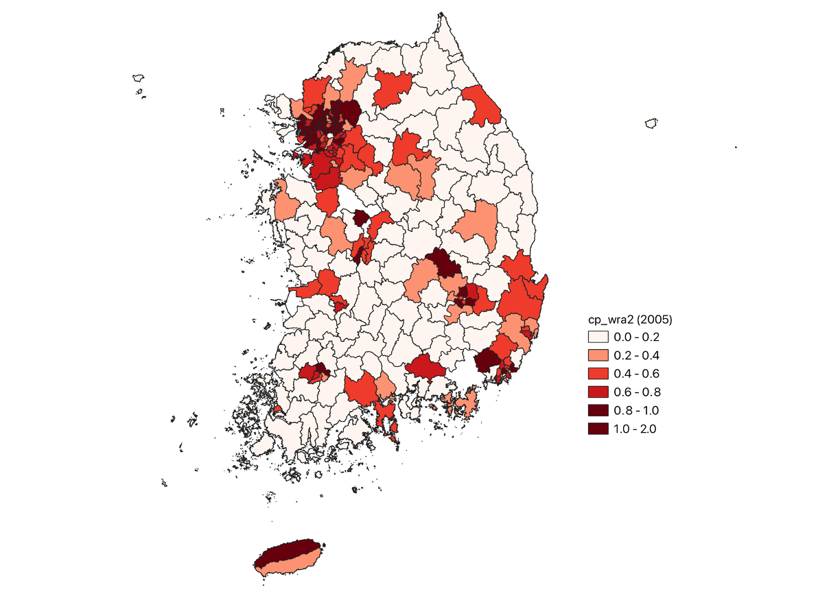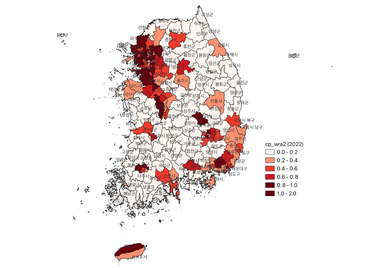 | cp_wra2 | 전국 가임가능여성인구 중 시도/시군구 가임가능여성인구 비중 [%] = (cp2 / cp3) * 100 |