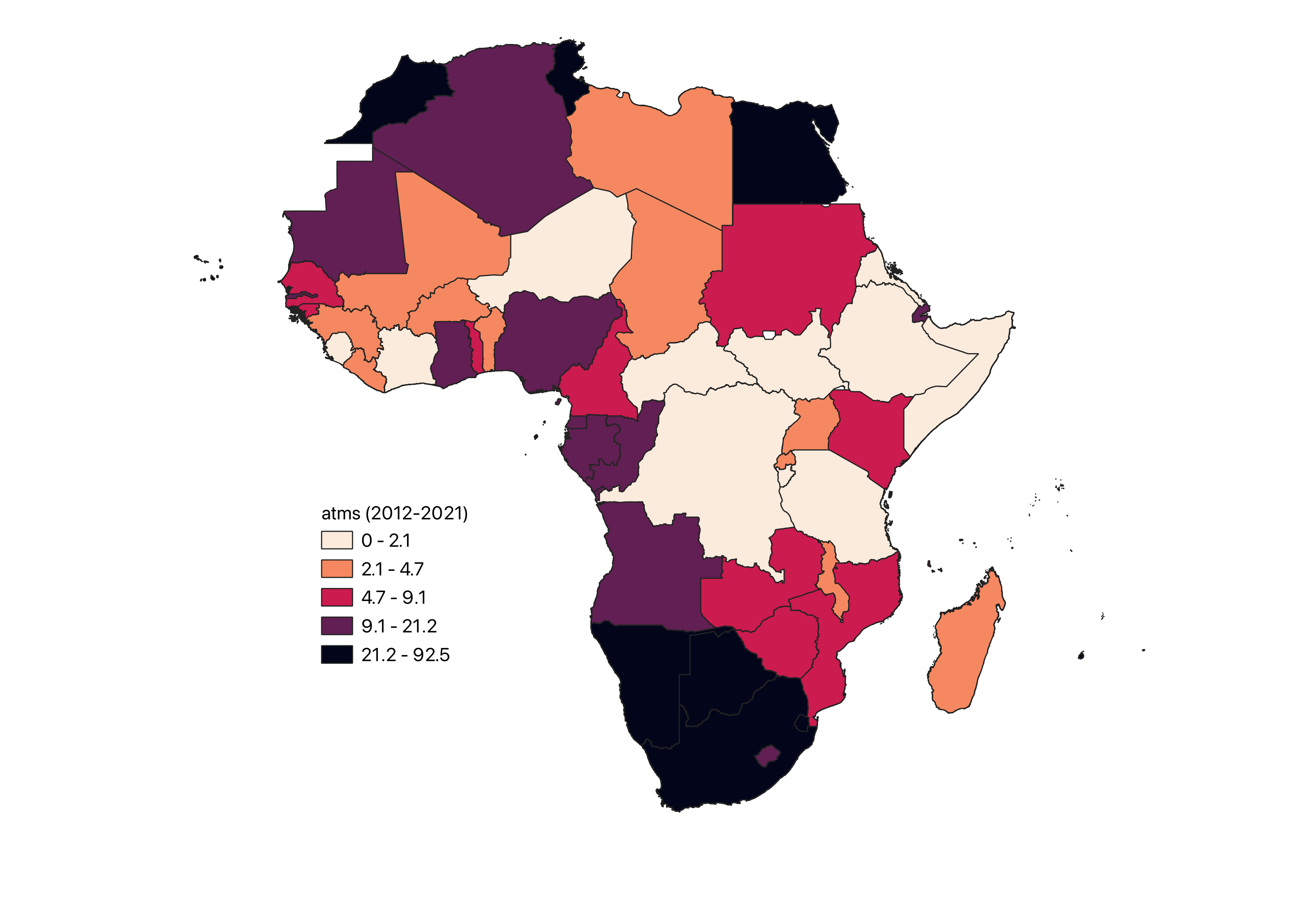 Data source: World Bank - ATMs (per 100,000 adults)* Kept the latest year data for countries with available data, and considered it as 0 for countries without data