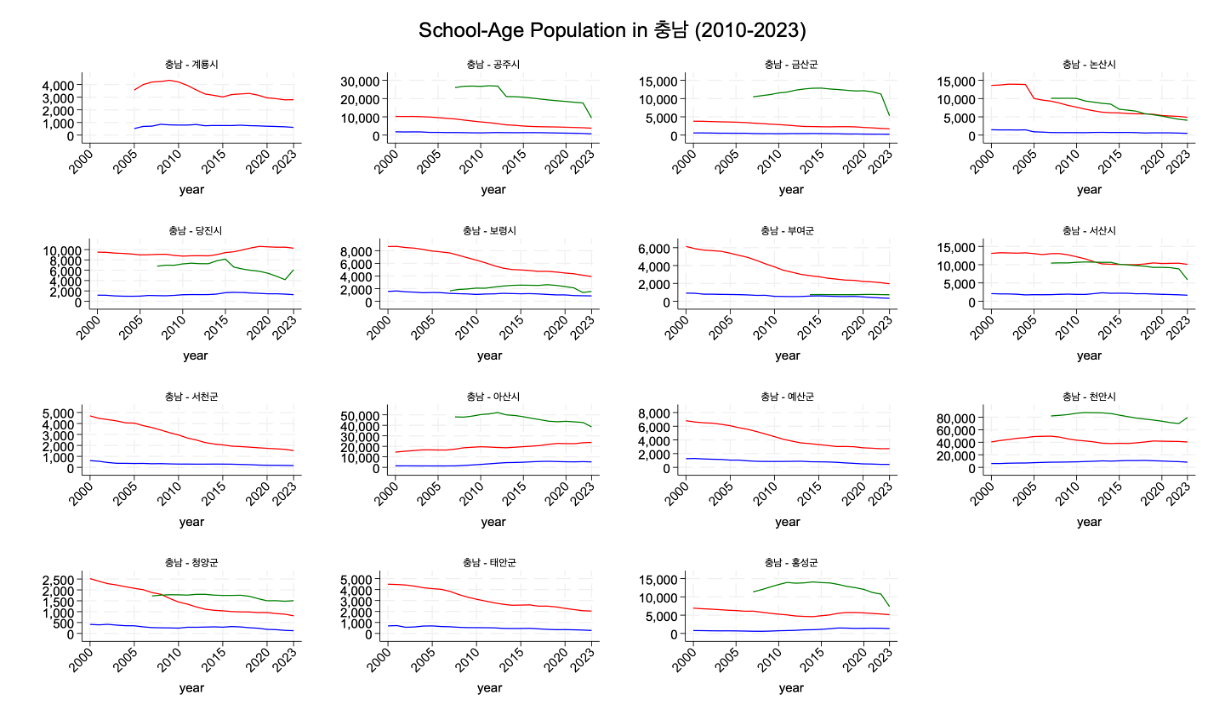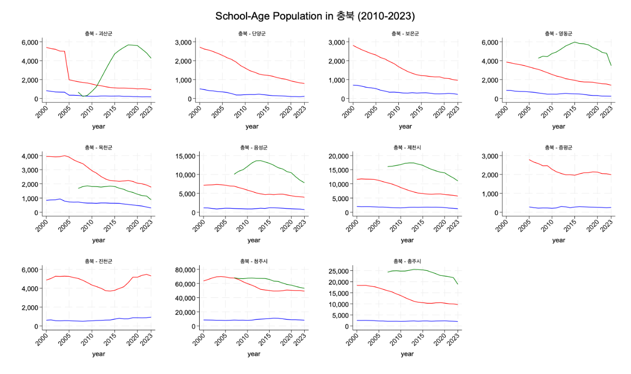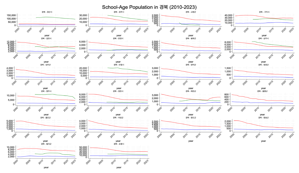 - Elementary (μ΄λ±νκ΅μ): red line (λΉ¨κ°μ μ ) 2000-2023