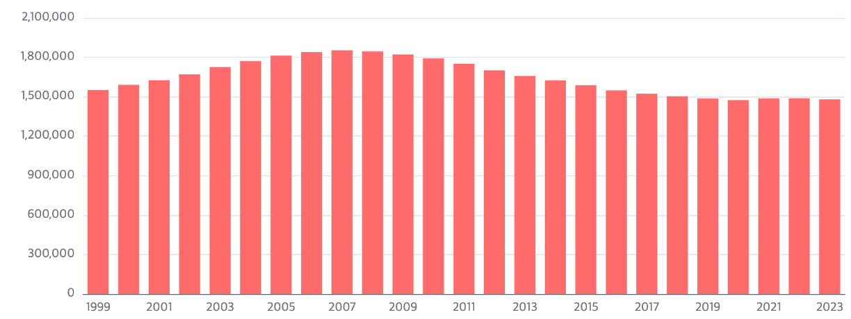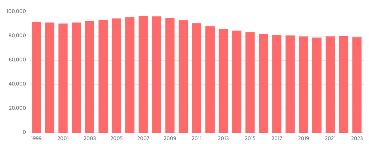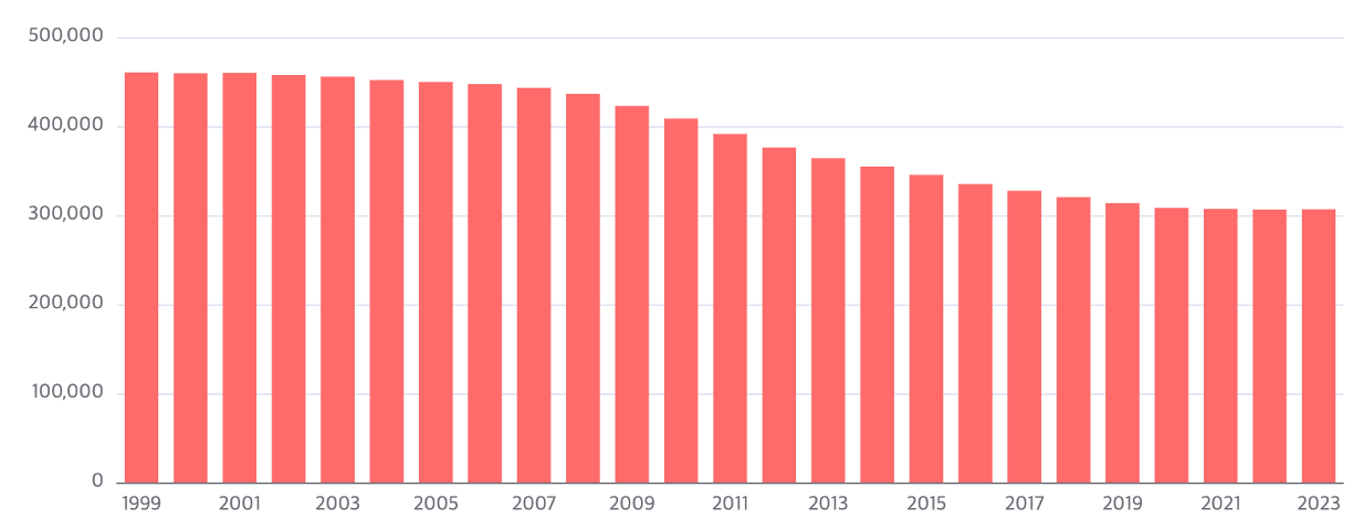 - Kindergarten (μ μΉμ μμ): blue line (νλμ μ ) 2000-2023