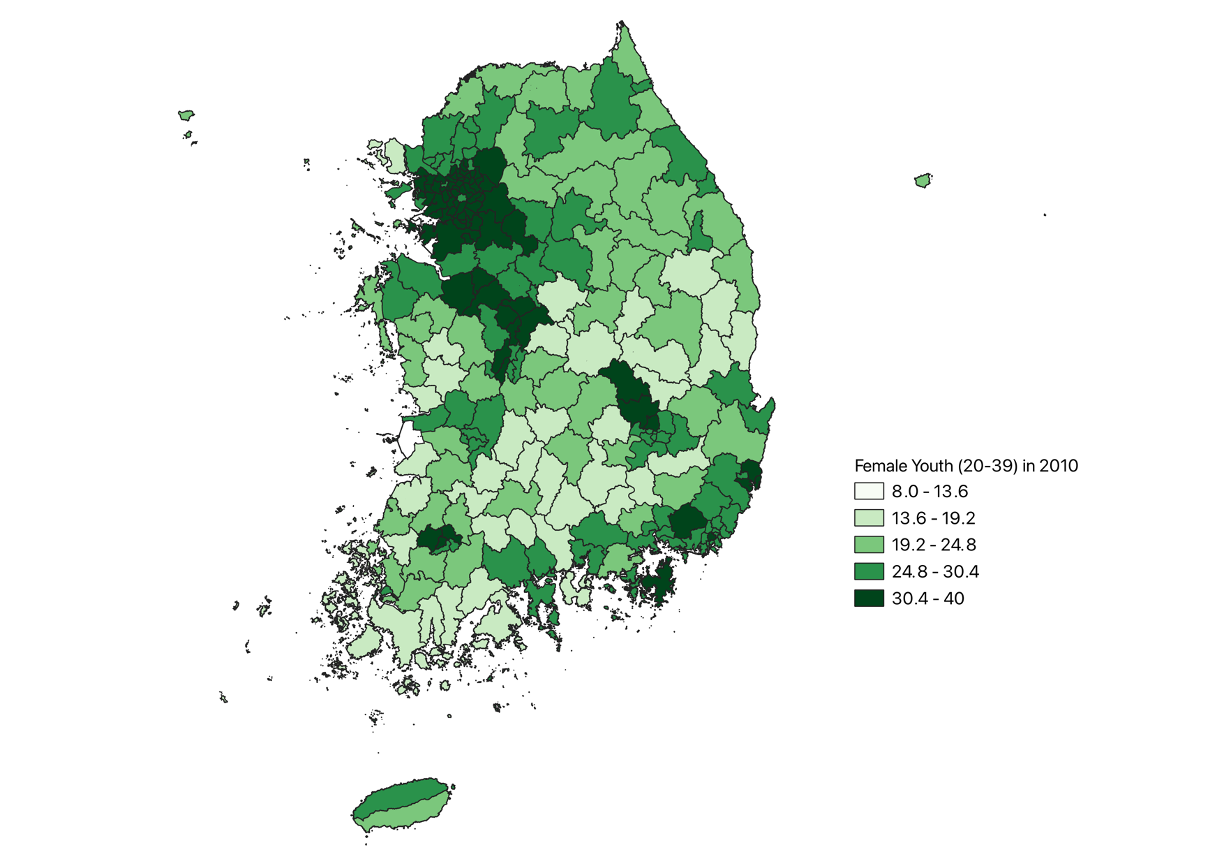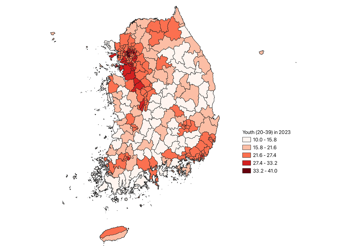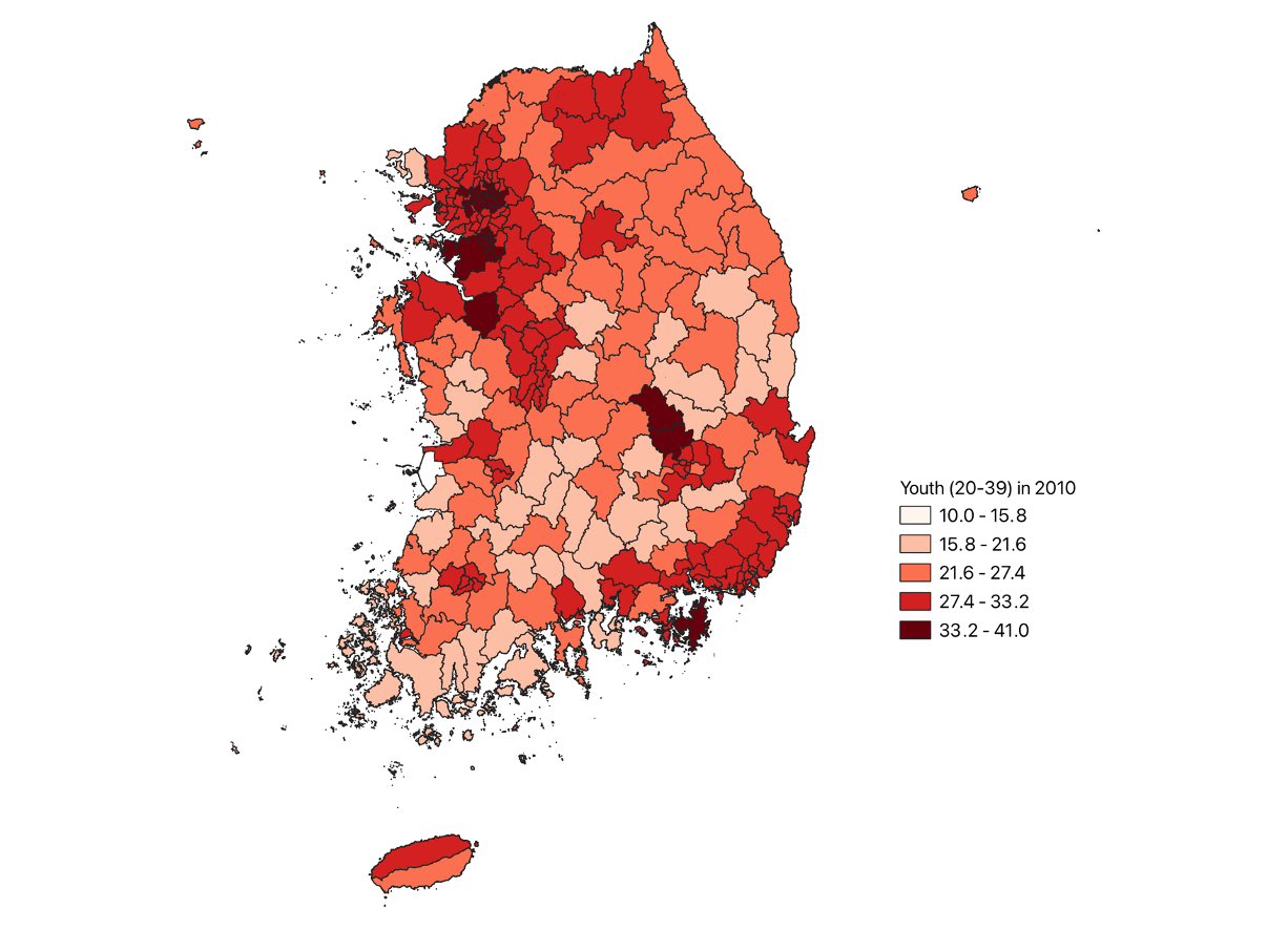 - ๊ตญ๊ฐํต๊ณํฌํธ(www.kosis.go.kr) ใ์ฃผ๋ฏผ๋ฑ๋ก์ฐ์์ธ๊ตฌใ ์๋ฃ๋ฅผ ์ด์ฉํ์ฌ ์ฐ์ถํจ (Calculated using data from the Resident Registration Mid-year Population at the Korea Statistical Information Service)