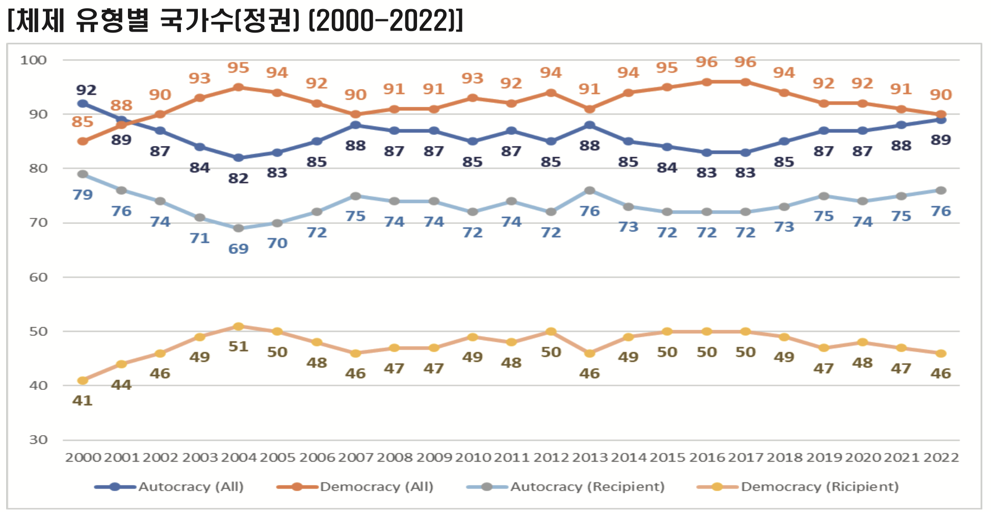 ์ฌ์ฒด์ * 2011-2022๋ ๊ธฐ๊ฐ ๋์ ์ฒด์ ๋ณํ ์์ด ์ง์์ ์ผ๋ก ๊ถ์์ฃผ์ ์ฒด์ ๋ฅผ ์ ์งํ๋ ๊ตญ๊ฐ๊ตฐ |