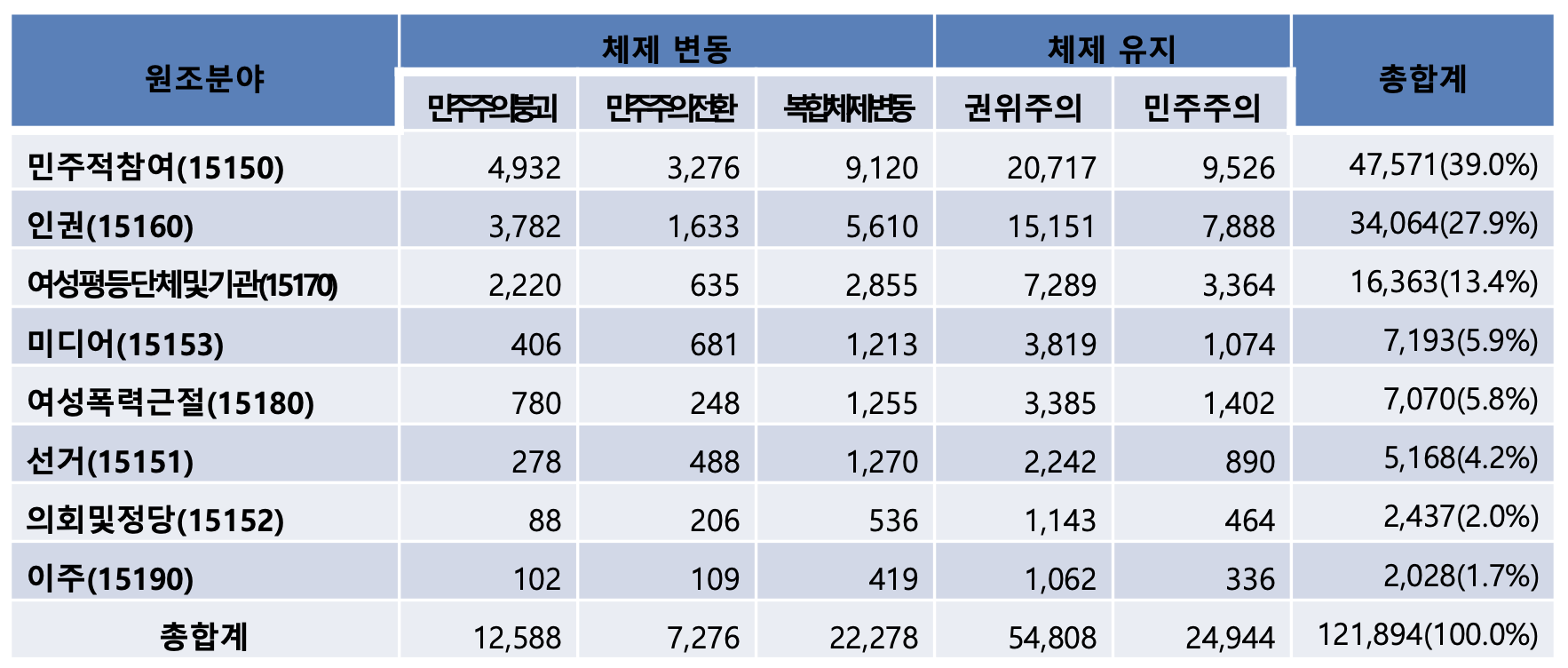 | ์์กฐ ๋ถ์ผ | ๋ฏผ์ฃผ์ ์ฐธ์ฌ(38.8%) > ์ธ๊ถ(28.1.%) > ์ฌ์ฑ๊ถ๋ฆฌ ์ ๋ ๊ตฌ์ถ(13.5%)์ด ๊ณตํต์ ์ผ๋ก ๋์ | ๋ฏผ์ฃผ์ ์ฐธ์ฌ(39.0%) > ์ธ๊ถ(27.9.%) > ์ฌ์ฑํ๋ฑ๋จ์ฒด ๋ฐ ๊ธฐ๊ด(13.4%)์ด ๊ณตํต์ ์ผ๋ก ๋์ | ์ฌ์ฑํ๋ฑ๋จ์ฒด ๋ฐ ๊ธฐ๊ด(57.6%) > ์ ๊ฑฐ(14.8%) > ์ธ๊ถ(12.0%)์ด ๊ณตํต์ ์ผ๋ก ๋์ ํนํ ์ฌ์ฑํ๋ฑ๋จ์ฒด ๋ฐ ๊ธฐ๊ด์ ๋ํ ์ง์์ด ์๋์ |