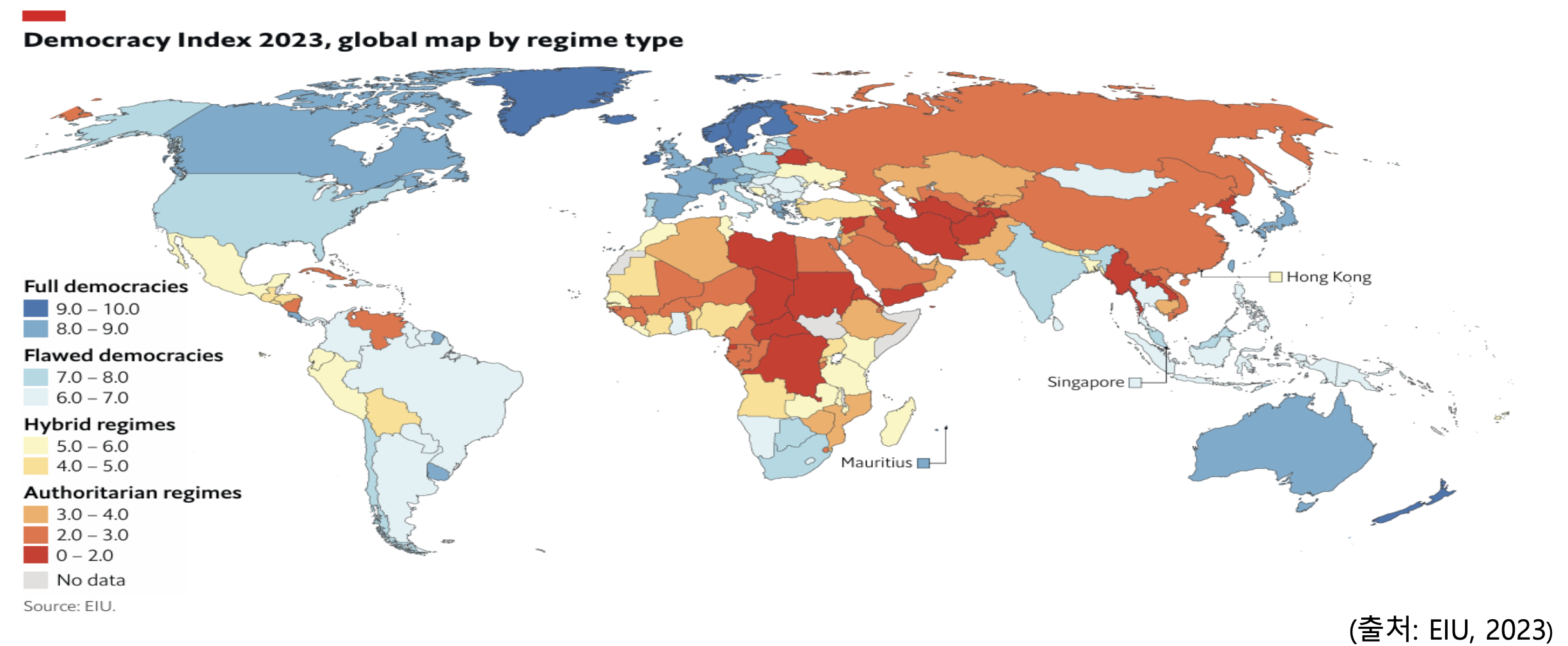 - Economist ๋ฏผ์ฃผ์ฃผ์ ์ง์(Democracy Index)๋ฅผ ํตํด ๋ณธ ๋ฏผ์ฃผ์ฃผ์ ํํฉ (2023)