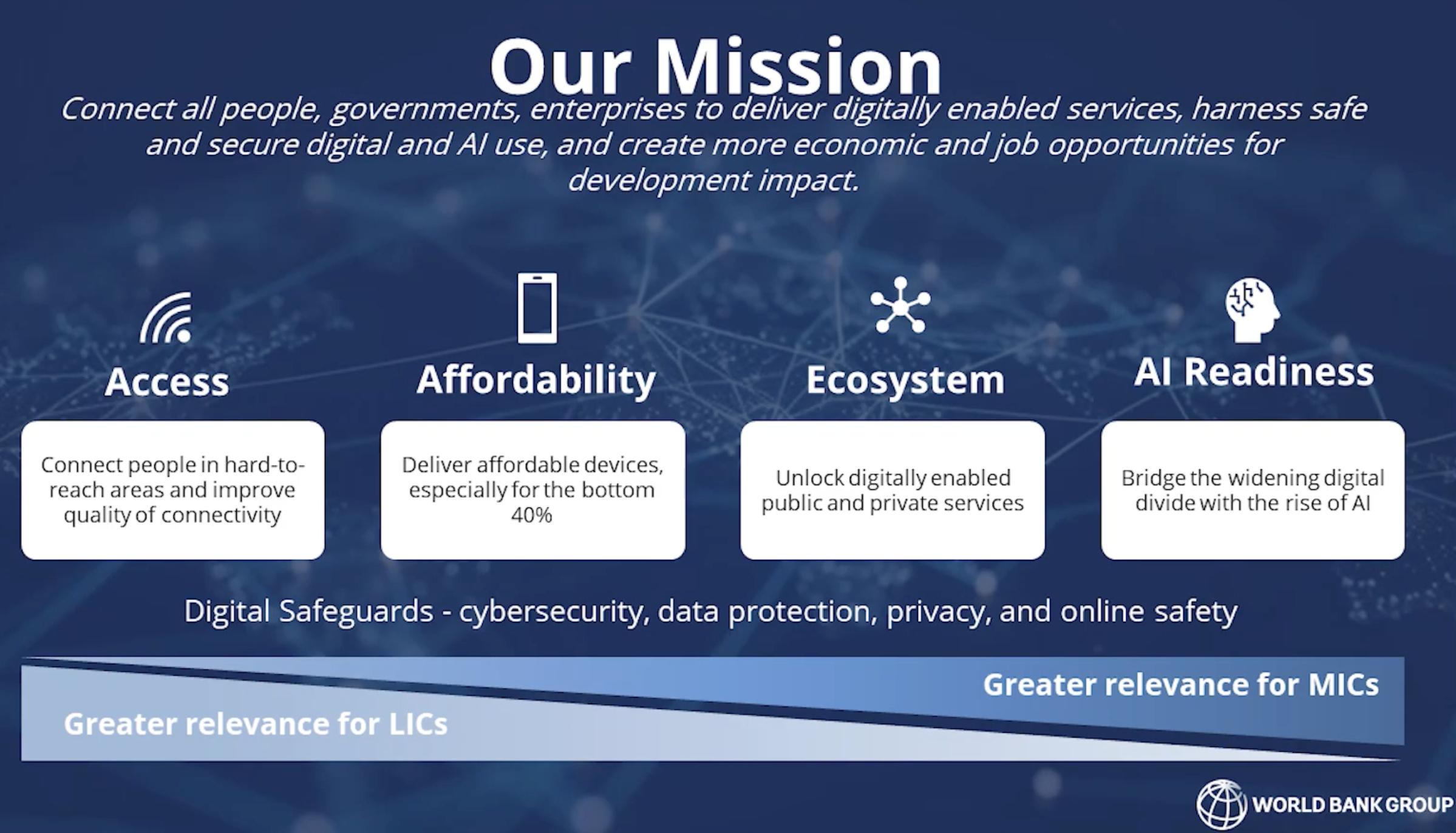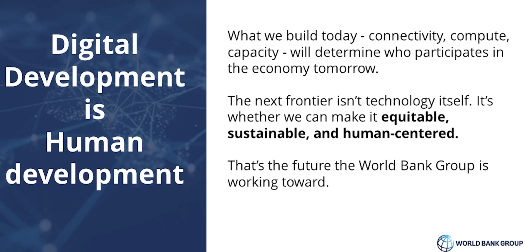 While digital technologies are powerful tools for boosting productivity, the World Bank's Digital VPU believes that digital development must be pursued in an equitable, fair, and environmentally sustainable way, and that it must be deployed safely and in a human-centered manner. Digitalization should serve as a means to reduce income inequality and narrow the income and opportunity divide by creating new opportunities for people in developing countries and for people everywhere to make a new leap forward. This transformation should not be driven solely by the interests of a few enterprises or by market expansion only, but anchored in inclusive and sustainable development outcomes.